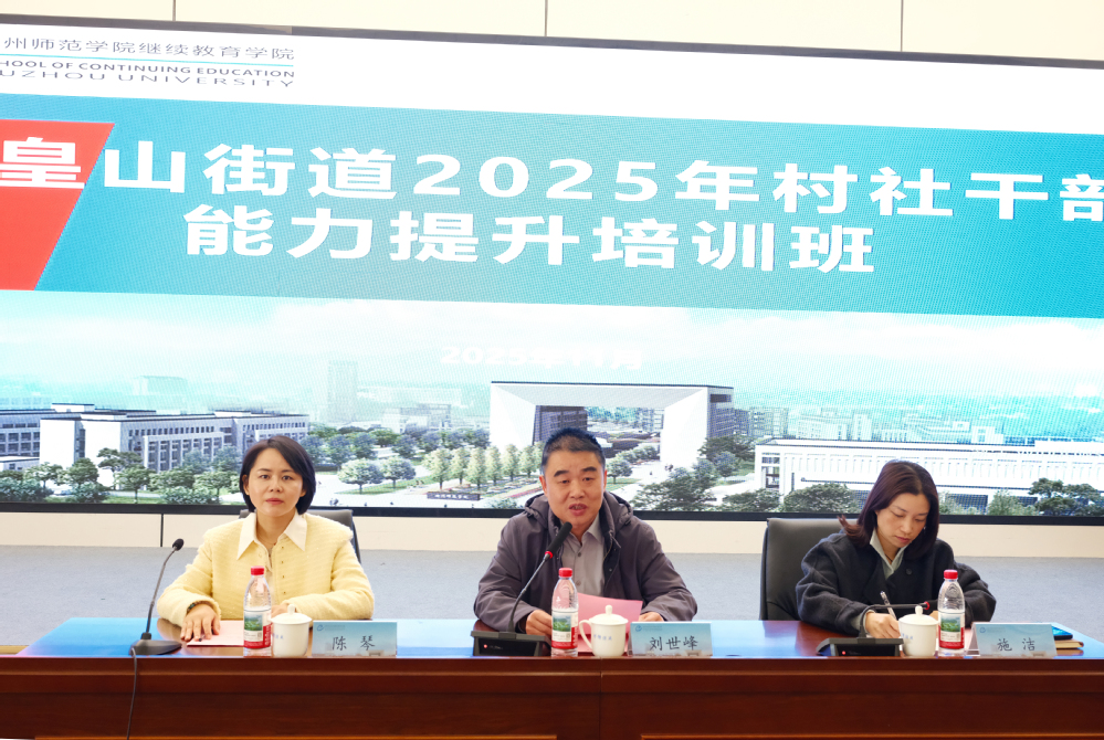 2025 年 11 月 19 日至 21 日,由湖州师范学院继续教育学院承办的仁皇山街道村社干部能力提升培训班成功举办。南太湖新区仁皇山街道党工委副书记施洁、我院院长刘世峰出席开班式,街道党工委书记卢晔佳出席结业仪式并讲授党课,街道各行政村、社区干部参训。