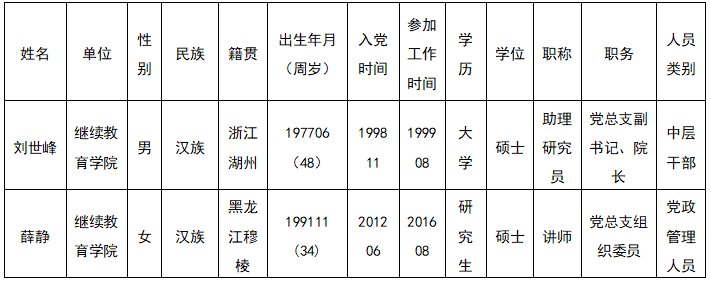 根据学校《中共湖州师范大学第一次代表大会代表产生办法》,经过广泛征求党员意见,各党支部推荐,并与学校党委沟通,继续教育学院党总支研究决定,拟将刘世峰等2名同志列为中共湖州师范大学第一次代表大会代表候选人初步人选,现予以公示(按姓氏笔画排序)。公示时间自2026年4月8日起至2026年4月10日(3天)。